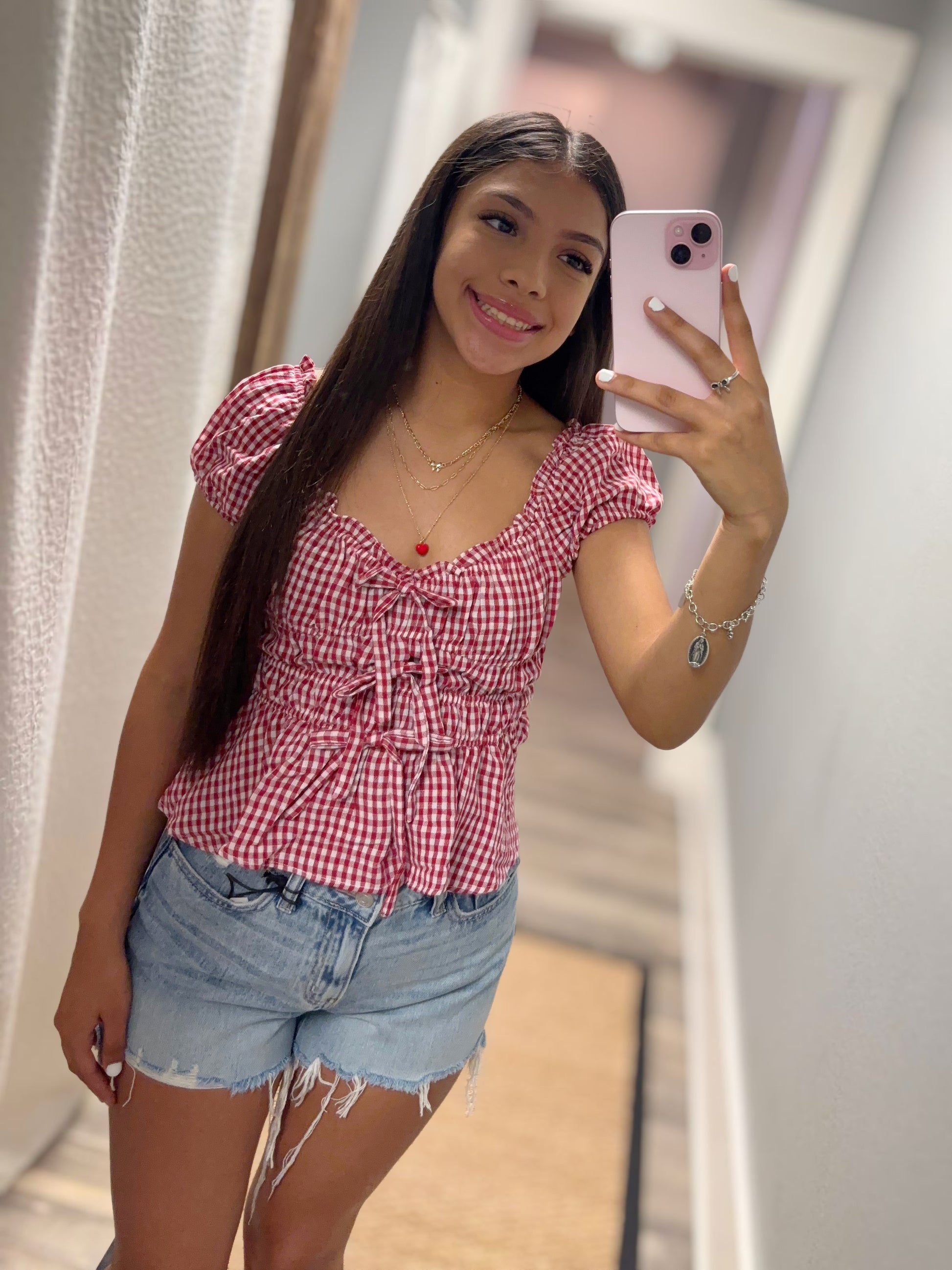 This Gingham Bow Top features a flattering sweetheart neckline and short sleeves, accented with a charming front bow tie detail for a sweet, stylish look.